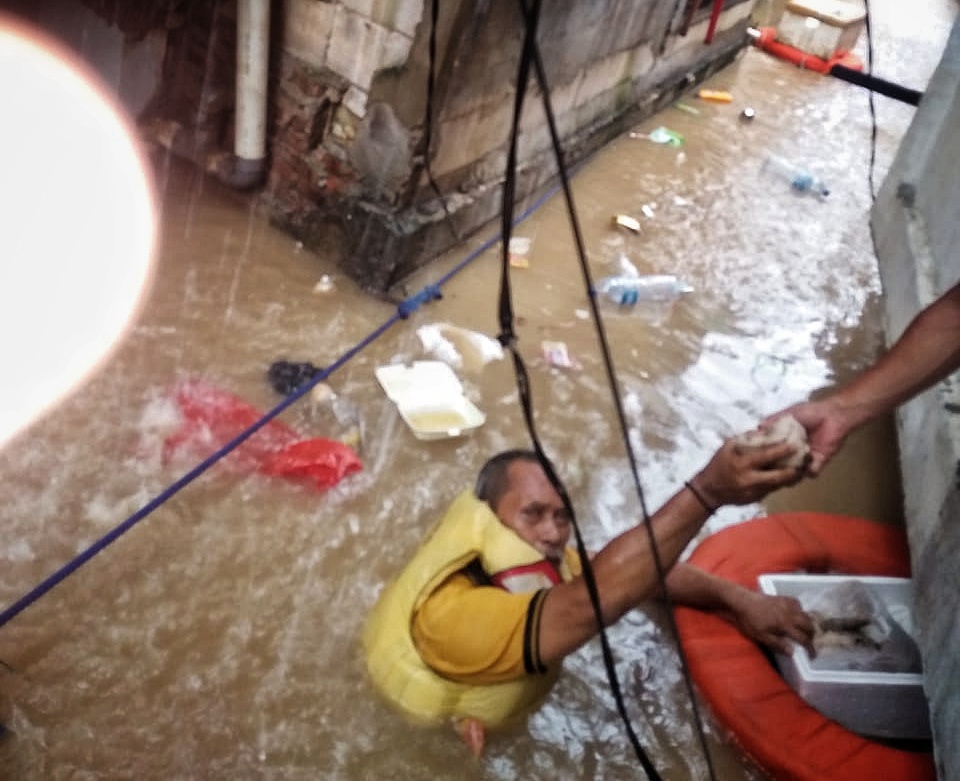 Pak Sanusi dengan dibantu ban karet yang sudah diisi kotak berisi paket- paket makanan, menelusuri jalan yang sudah berubah menjadi sungai kecil untuk memberikannya kepada warga yang tidak mengungsi. Pancaran semangat dan kegigihan tampak di wajahnya, menghampiri satu persatu warga kampung Melayu di RT 13/08 Jatinegara Jakarta Timur.