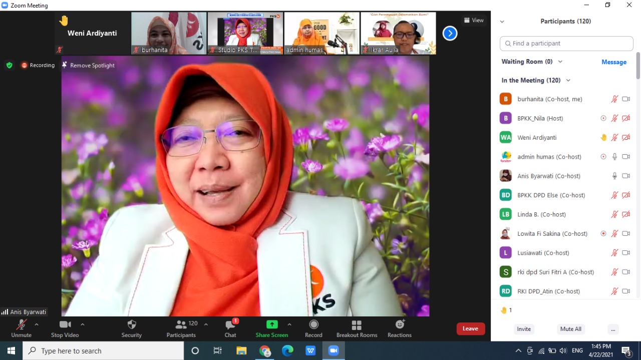 Anggota DPR RI Fraksi PKS dari daerah pemilihan Jakarta Timur, Anis Byarwati, hadir dan menjadi pembicara dalam acara webinar yang diselenggarakan oleh Bidang Perempuan dan Ketahanan Keluarga (BPKK) DPD PKS Jakarta Timur, pada Kamis (22/4/2021). Webinar dengan tema Giat Perempuan Selamatkan Bumi ini, digelar dalam rangka memperingati hari Kartini yang jatuh pada tanggal 21 April dan hari Bumi yang jatuh pada tanggal 22 April.